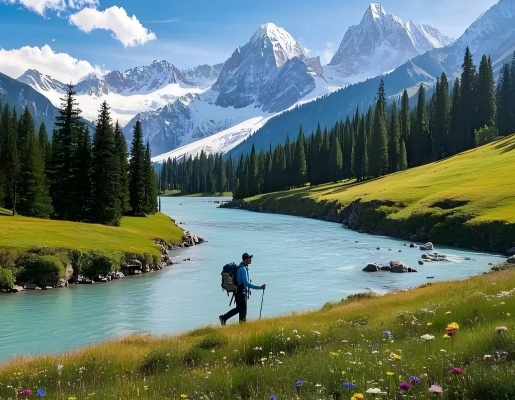 After breakfast, proceed to the Hundred-Mile Gallery of the Tangbula Grassland, where river valleys and towering peaks interplay in breathtaking harmony. Upon arrival at the the Mengket Ancient Road to admire the scenic beauty of the Hundred-Mile Gallery. Surrounded by picturesque landscapes and vast seas of flowers, stroll along the riverbank or through the forest. Gaze upon the layered green peaks, look down upon the scattered yurts and livestock in the valley below, listen to the gentle murmur of the river nearby, and hear the intermittent cries of eagles in the distance. After dinner, check into the hotel for rest.